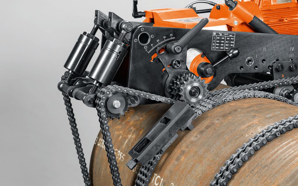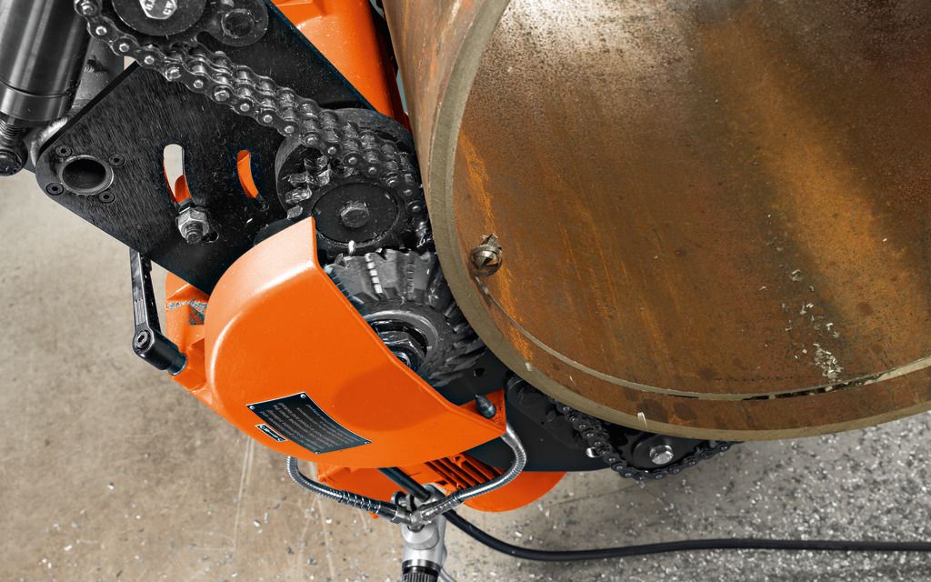 Für den Umlauf eines Rohres benötigen die Modelle FEIN RSG 1500 und RDG 1500 wenig Platz. Passend zu den jeweiligen Rohrdurchmessern lassen sich die Gliederketten variabel einstellen. Das Zwei-Ketten-System mit getrennten Federspanntöpfen ermöglicht zudem verspannungsfreie Schnitte von 250 bis 1.500 Millimeter Durchmesser. Die neue und optional erhältliche Führungskette hält die Rohrfräsmaschine in der Spur und ermöglicht einen präzisen Schnitt ohne Versatz auch bei Toleranzen in den Rohren oder spiralgeschweißten Rohren.
