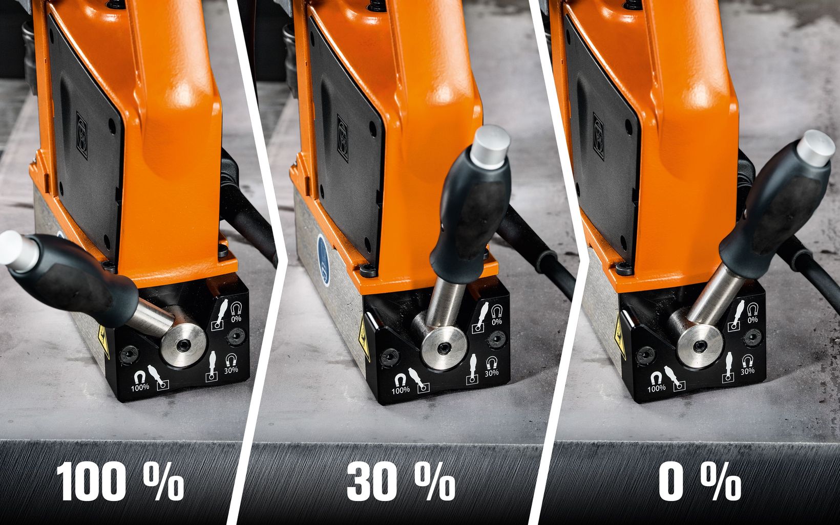 Users can manually bias the permanent magnet. In other words, they move the mechanical lever to 30 percent which enables the magnet to hold the weight of the tool. The next step is to position the tool on the workpiece, which may be overhead depending on the application. Then, they move to the drill point and use the mechanical lever to set the permanent magnet to 100 percent holding force. The tool can only be started once it is fully fixed into place.